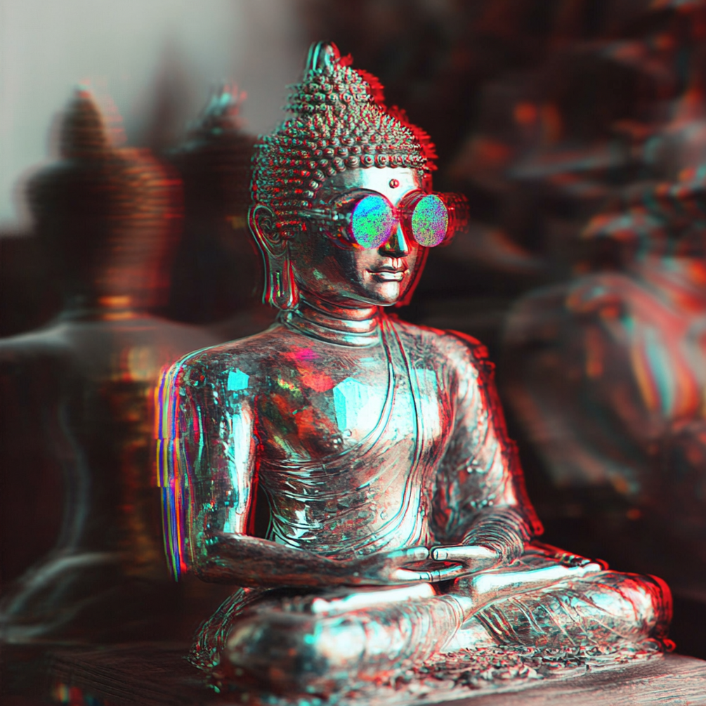 A striking Buddha statue, crafted from prismatic crystal, sits in tranquil meditation. But this Buddha has a modern twist—perched on its serene face are a pair of sleek, reflective sunglasses. The glasses catch the light, adding a touch of charisma that sets this statue apart. Despite its ancient wisdom, the Buddha exudes an effortless coolness, as if it understands the pulse of the present moment. The statue radiates a unique blend of calm and confidence, as if reminding onlookers that true enlightenment can be both wise and wonderfully cool.